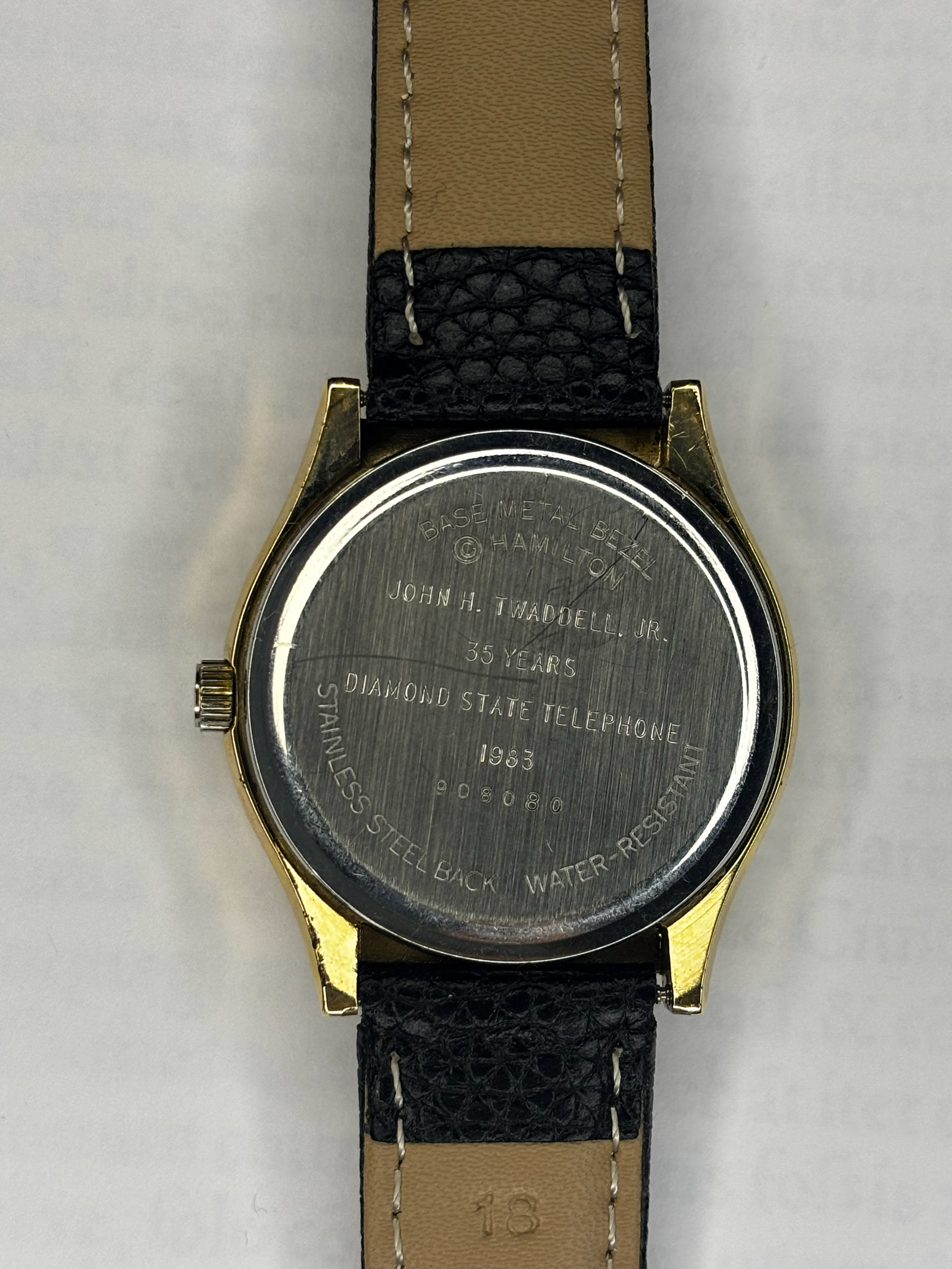 This Hamilton Quartz 90880 Day-Date Bilingual (english and chinese) once belonged to a devoted American — a military veteran who served during the Korean War and later dedicated over three decades of his life to a major telephone company. It was gifted to him in recognition of his long and loyal service, a private tribute still engraved on the caseback. Far from a flaw, this marking is a signature of honor.