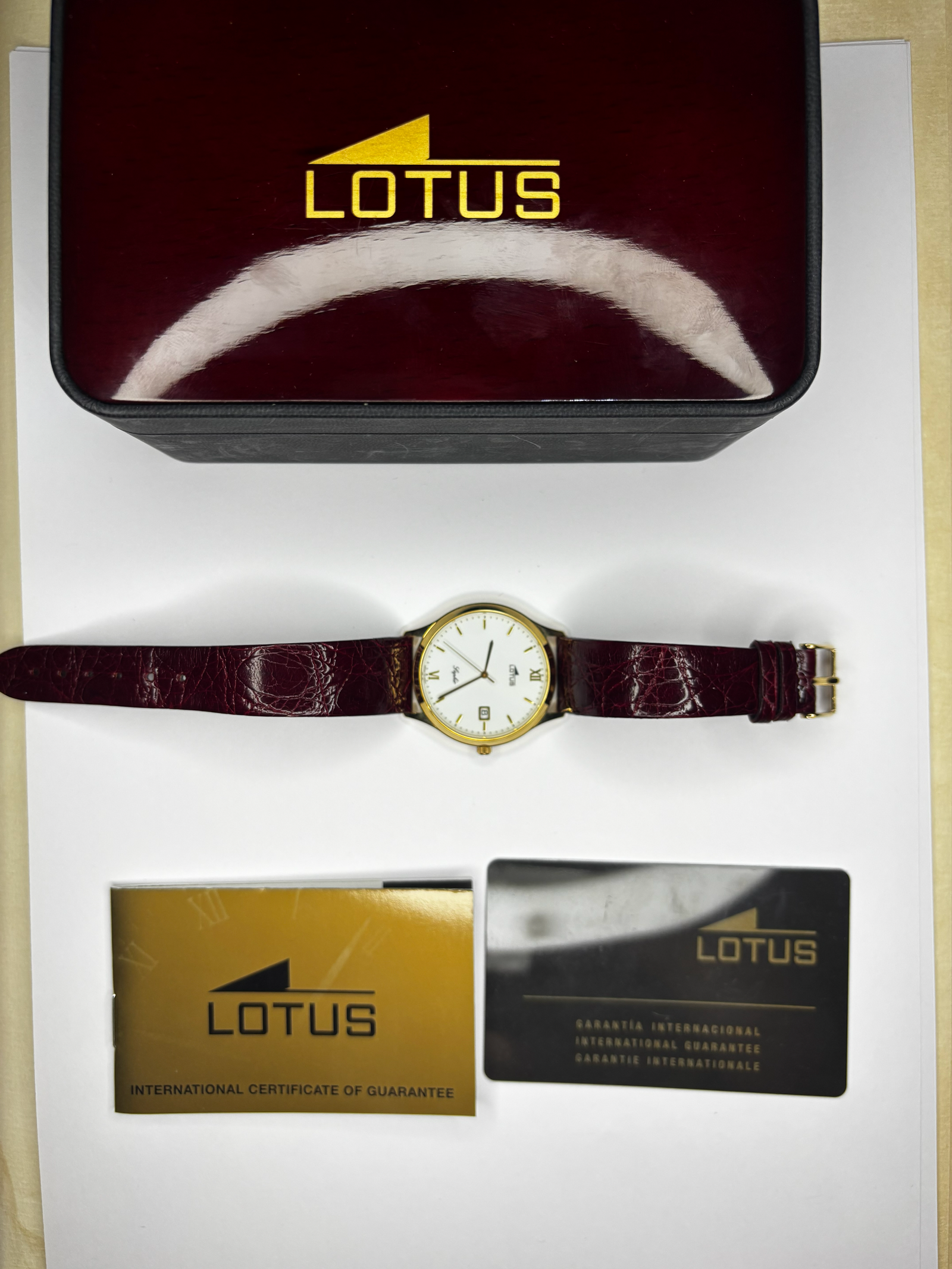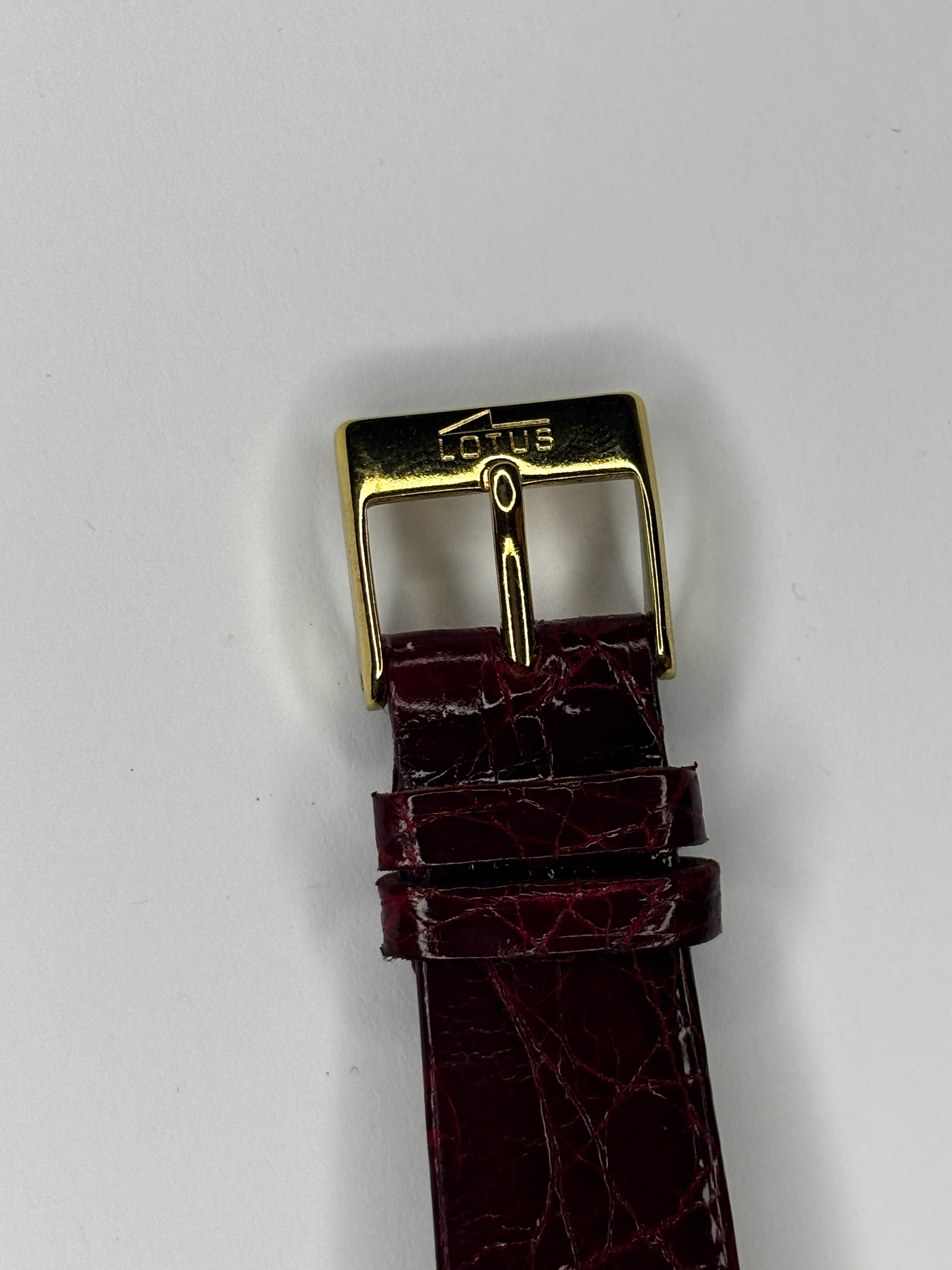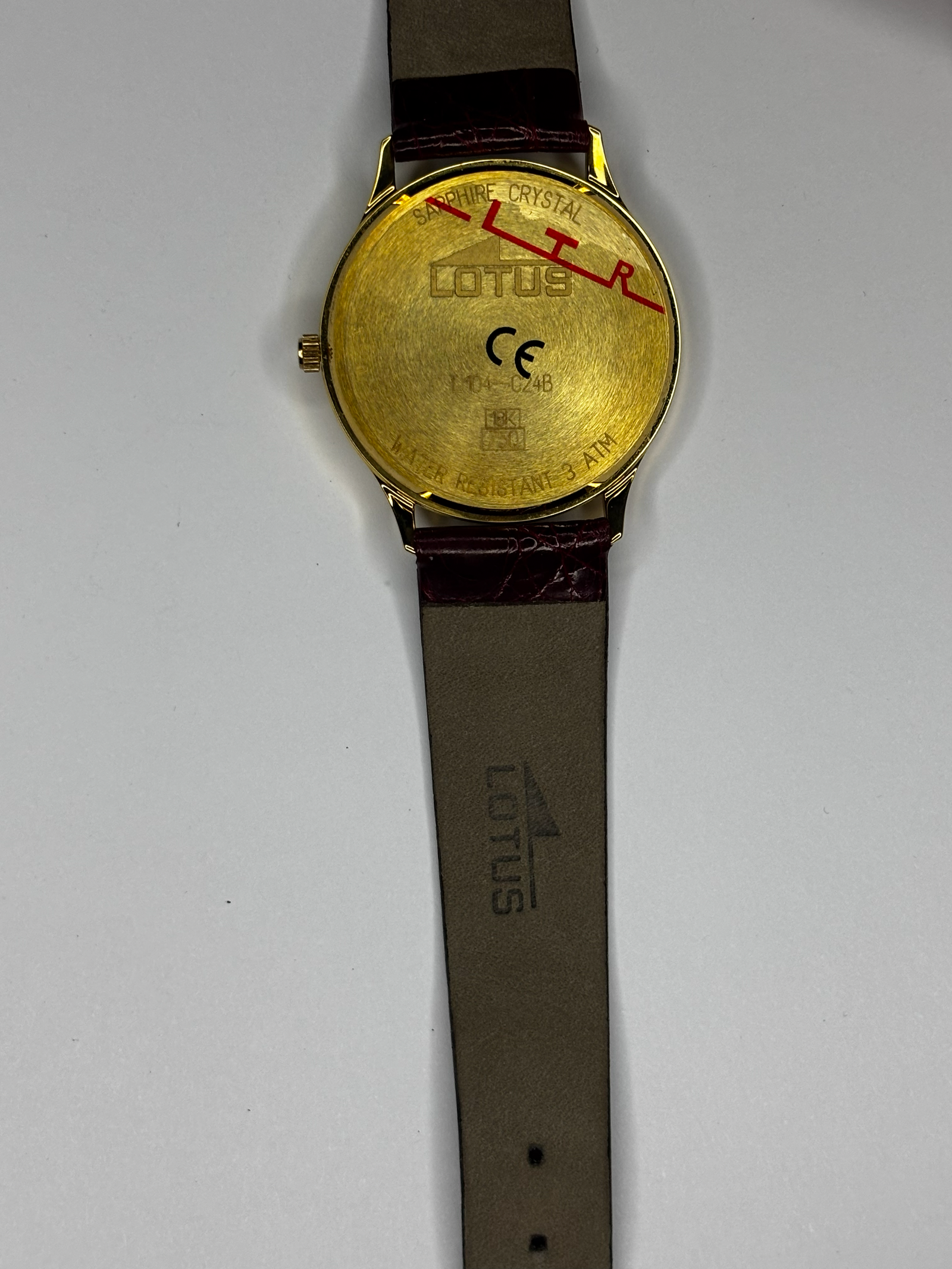 This Lotus Saphir Automatic, clad in 24K gold and bound by a deep crimson strap, was never made for hesitation. Brand new, still kept in its box, it stands untouched — a vow yet to be worn.