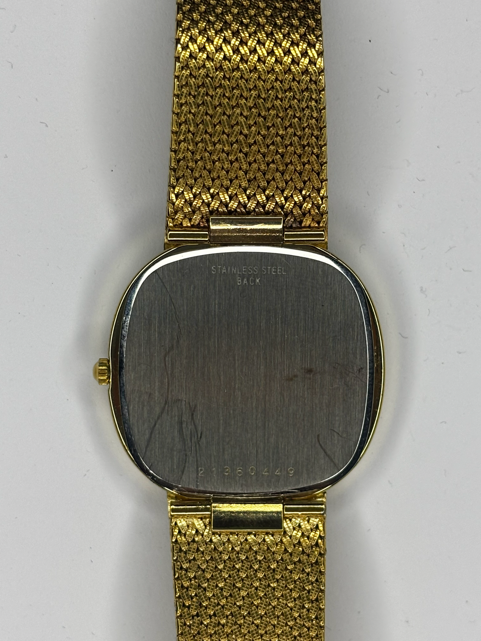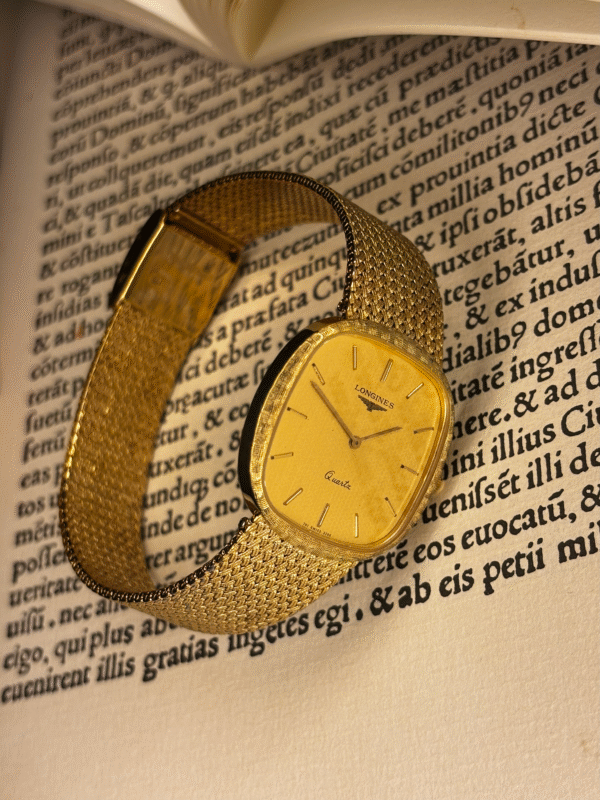 This Longines Quartz 21360449, adorned with a finely braided gold-plated bracelet, carries the grace of quiet departures — the elegance of someone who once raised a final glass, leaving only a silhouette and a promise behind.